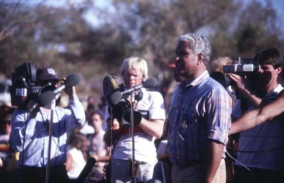 The scene is set. A sea of black faces, the red earth, and the red black and yellow Aboriginal colours on headbands, t-shirts and flags. Waiting for the representatives of white man’s society to ‘give back’ what had been theirs for 40,000 years.