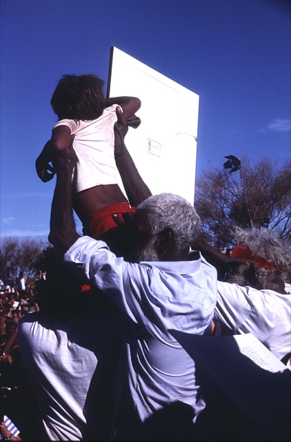 I point out Yami Lester, Aboriginal spokesperson and activist, and tell Caroline that his blindness was allegedly caused by British atomic bomb tests in the fifties. The excitement is growing by the minute, with Yami periodically addressing the crowd over the sound system.