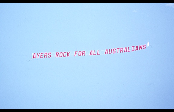 The photographers and film crews are shooting furiously, and the excitement is at a crescendo, when the mood is rudely shattered. A light plane, circling the ceremony and trailing behind it a banner, snarls its message. “AYERS ROCK FOR ALL AUSTRALIANS.”