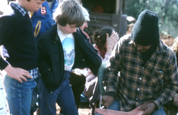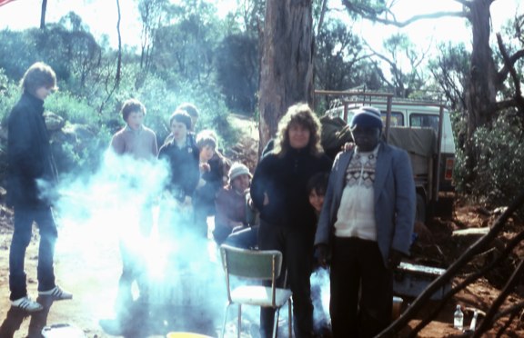 For the next few months a motley mixture of visitors trooped up to the summit. Many were supporters, many were hostile. Mini-buses of Aboriginal kids visited, as did Northern Territory Aboriginals, politicians, louts, and everything in between. A very dominant presence was that of the police. Jimmy James of course, was a police tracker, extremely famous for the cases he had helped the police with. He had tracked lost kids, escaped convicts, criminals, and was feted in South Australian newspapers and media. He was a Pitjantjatjara man from South Australia’s far north, but had married a Ngarrindjeri woman, so became a relative by marriage to Bluey Roberts, who to some extent was taught some of Jimmy’s skills. I was disgusted therefore, to observe a police Aboriginal liaison officer telling Jimmy that the Police had ‘lost respect’ for him, because of his stand.