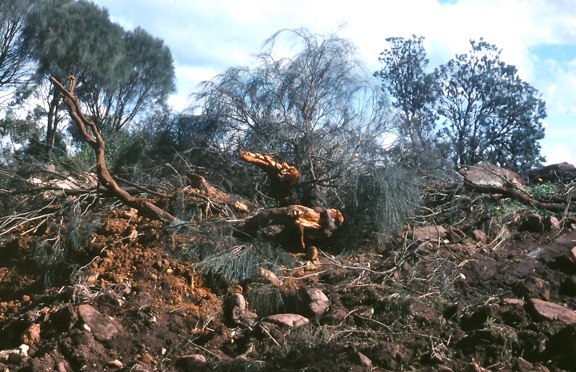 On the northern tail, a quarry saw the first major assault on the mount, although this did not affect the general ambiance of the experience for those accessing via the track. All of this was to change; in 1984. One day while driving up the track I noticed that a trench had been dug along the left side of the road. I was curious about this, but became more alarmed when I read in the Mount Barker Courier that a police communications tower was to be erected. There was no further information, either of location, height, what procedure had been undertaken to allow a tower on the site, or anything at all; yet the work proceeded. One day I discussed the tower proposal with a fiery red headed lady friend of mine, who had a passion for environmental causes, and the ability to inspire both dedicated commitment, and unmitigated hatred.